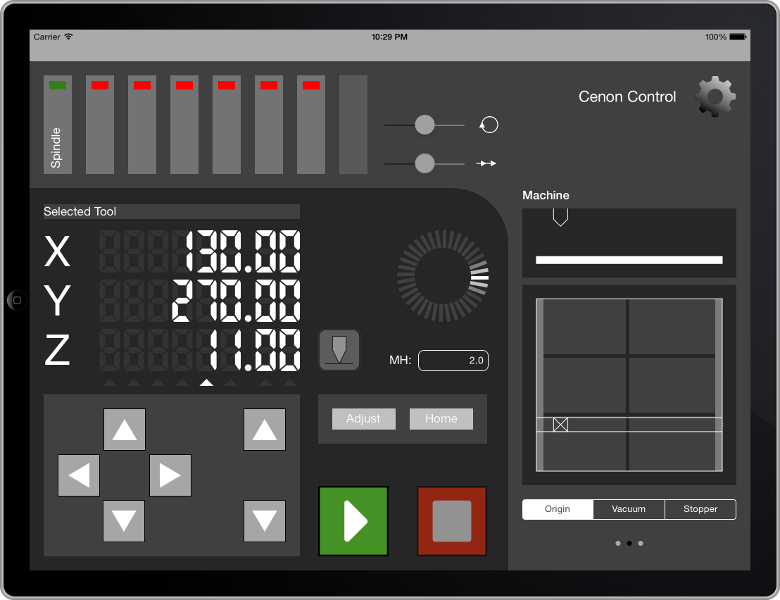 The Cenon Control app is a machine control-panel for the manufacturing software Cenon CAM (running on Mac). Cenon Control connects to Cenon via your local WiFi network. Once connected, you can control your machine and output via the iPad, right from the best position around your machine, and with a perfect view of your work piece.