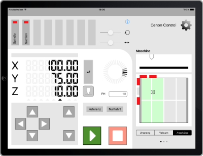 Das Kontrol-Panel erlaubt die Positionierung der Maschine, sowie das anschliessende Starten und jederzeitige Unterbrechen der Ausgabe. Maschinenfunktionen wie Spindel-Drehzahl und Vorschub können noch während der Ausgabe angepasst werden. Manuelle Schalter erlauben bei Bedarf auch eine manuelle Schaltung von Kühlung, Spindel, Spannvorrichtungen, etc.