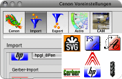 Für eine möglichst problemlose Datenübernahme benötigt man einen vielseitigen Daten-Import Cenon bietet: PostScript (PS, EPS), PDF, Adobe-Illustrator (mit PS-Header), DXF, SVG, Gerber, HPGL, Bohrformate nach DIN/ISO (Sieb&Mayer, Excellon, Wessel), NC-Daten/G-Codes).