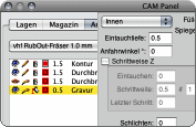 Neben der Zuordnung von Werkzeugen verlangt die masshaltigen Fertigung dabei wichtige Werkzeug-Korrekturen (Innen-/Aussen-Korrektur, Ausspitzen beim Gravieren), sowie Füllalgorithmen (Linienfüllung in beliebiger Richtung, Konturfüllung).