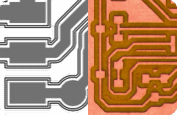 | | Isolationsgravur mit Entgraten Layout-Daten können im Gerber-Format oder PostScipt importiert werden. Cenon unterstützt das extended Gerber-Format, so dass Sie sich nicht mit Aperture-Tabellen herumschlagen müssen. An schmalen Stellen der Isolationsgravur bilden sich gerne ungewünschte Grate. Diese werden durch die Entgratungs-Funktion von Cenon entfernt. |