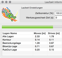 Das Bild (rechts) zeigt eine Laufzeit-Berechnung mitten in der Ausgabe: Die Lage "Kontur" wird aktuell bearbeitet, in Rot wird die Restzeit der auszugebenden Lagen angezeigt, Grün wird die tatsächliche Ausgabezeit (bis zum aktuellen Stand bzw. der letzten vollständigen Ausgabe) angezeigt.